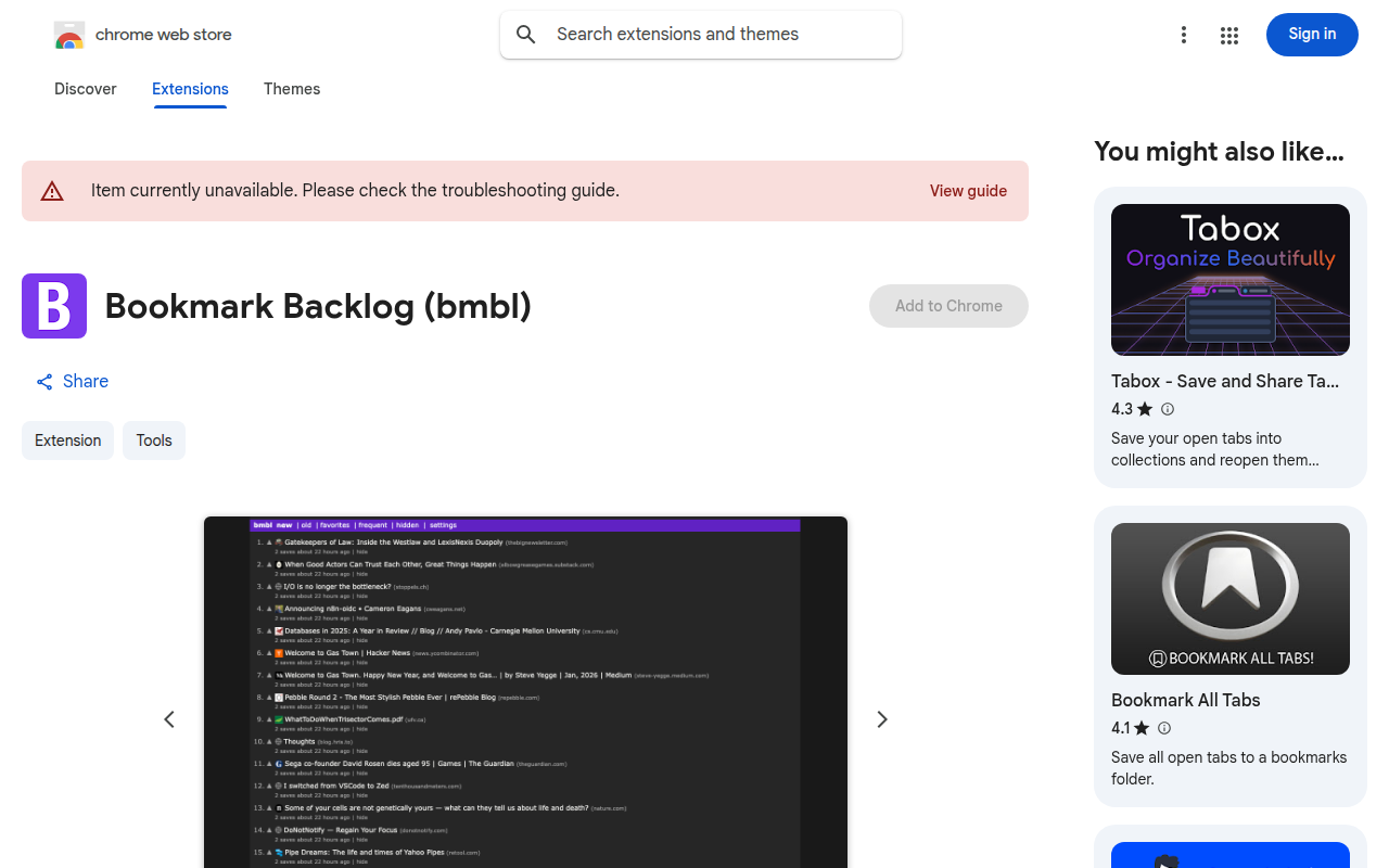 bmbl is a Chrome extension that captures all open tabs across windows and displays them in a clean, information-dense interface for reviewing and prioritizing. Features include one-click saving, smart deduplication, favorites, multiple sort views, soft delete, tab group support, dark mode, and local-first storage using IndexedDB.