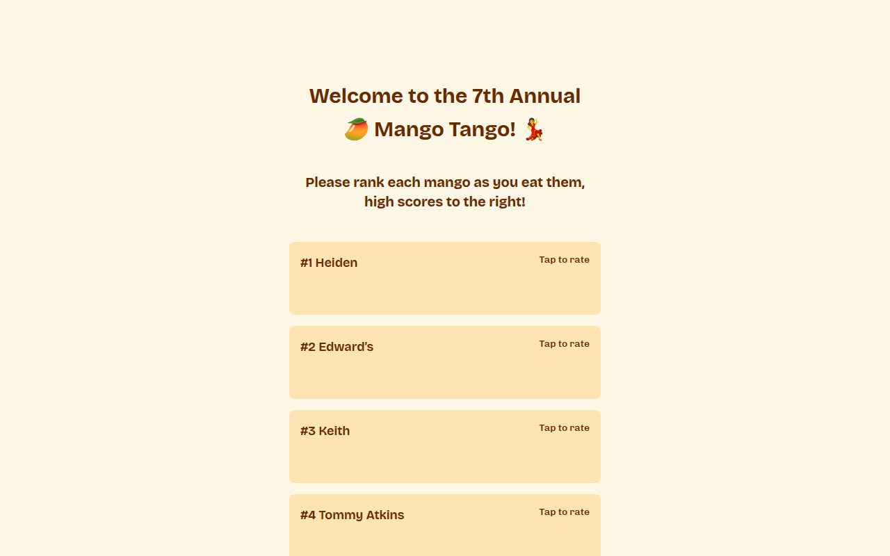 A web application built with Next.js for managing mango tasting notes and comparisons. Created with v0.dev and Magic Loops, this app allows users to submit mango tasting information and view results in an organized interface.